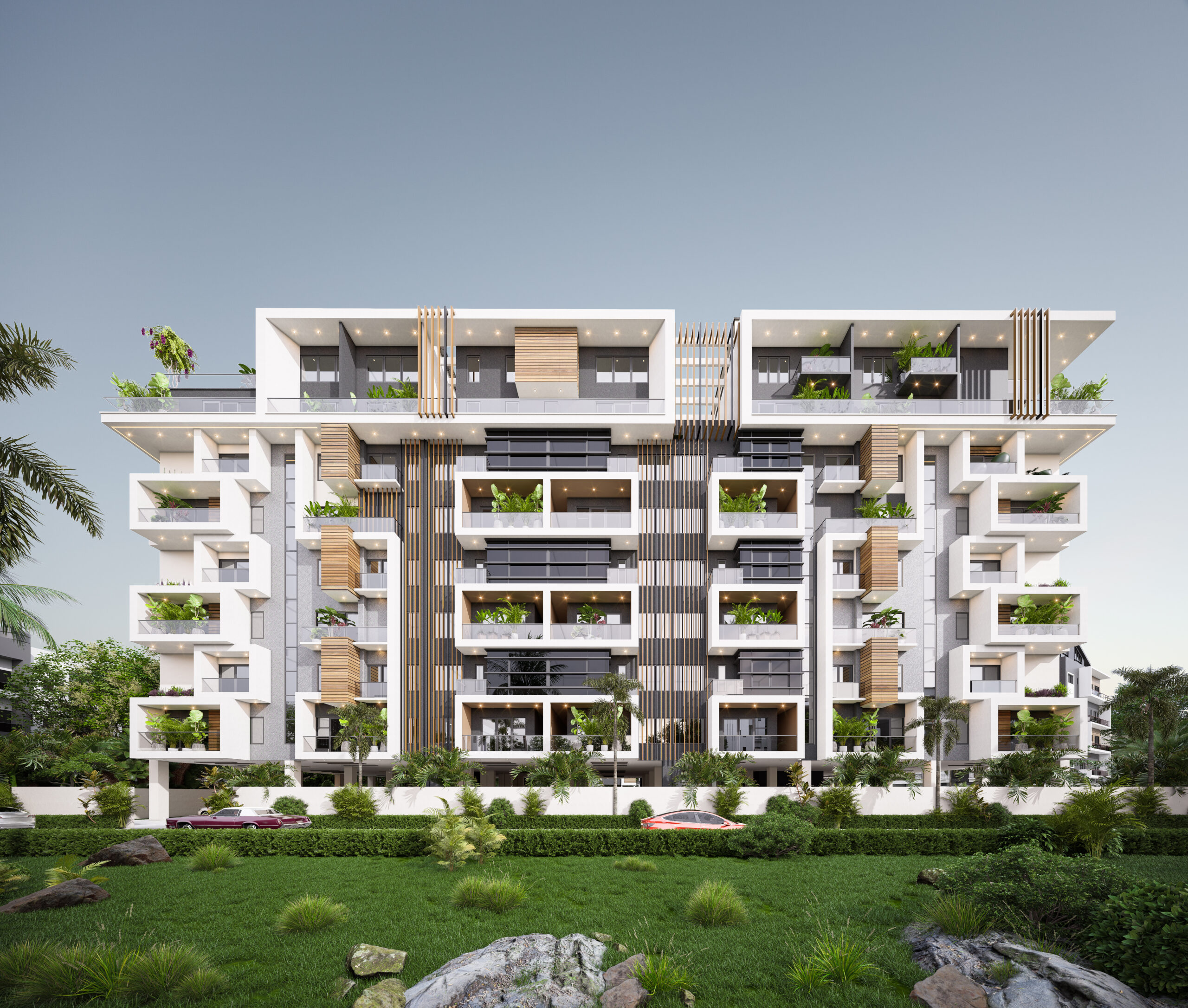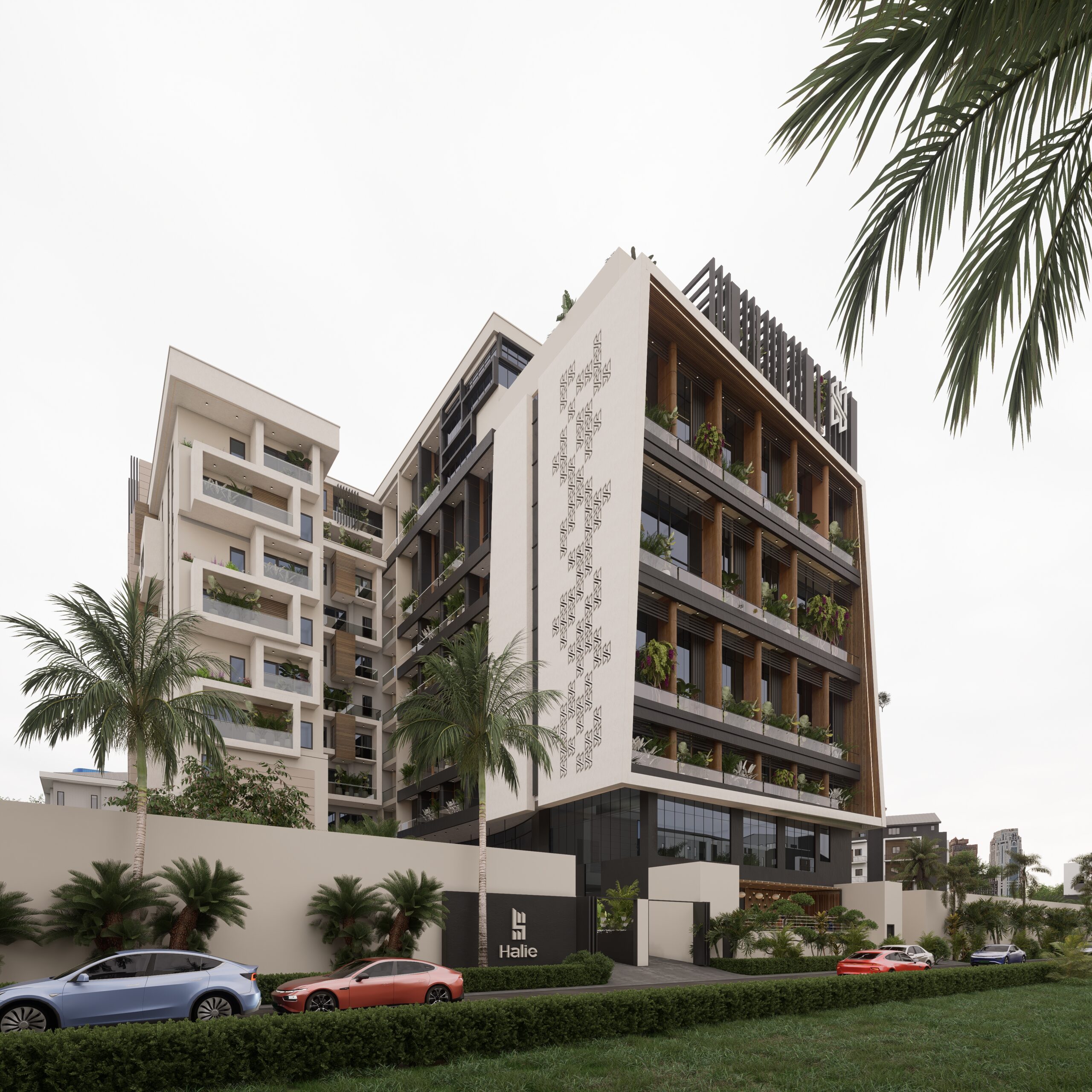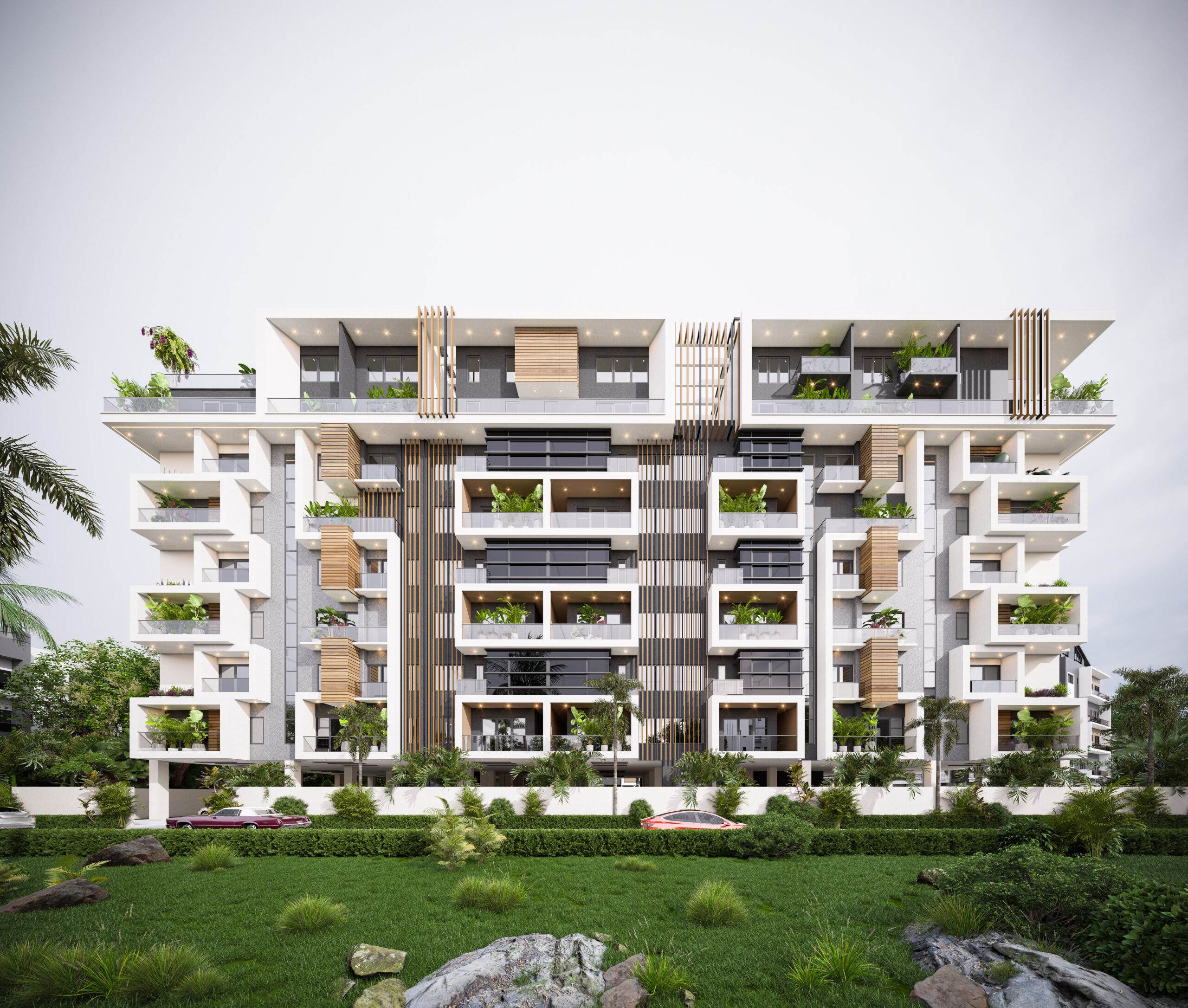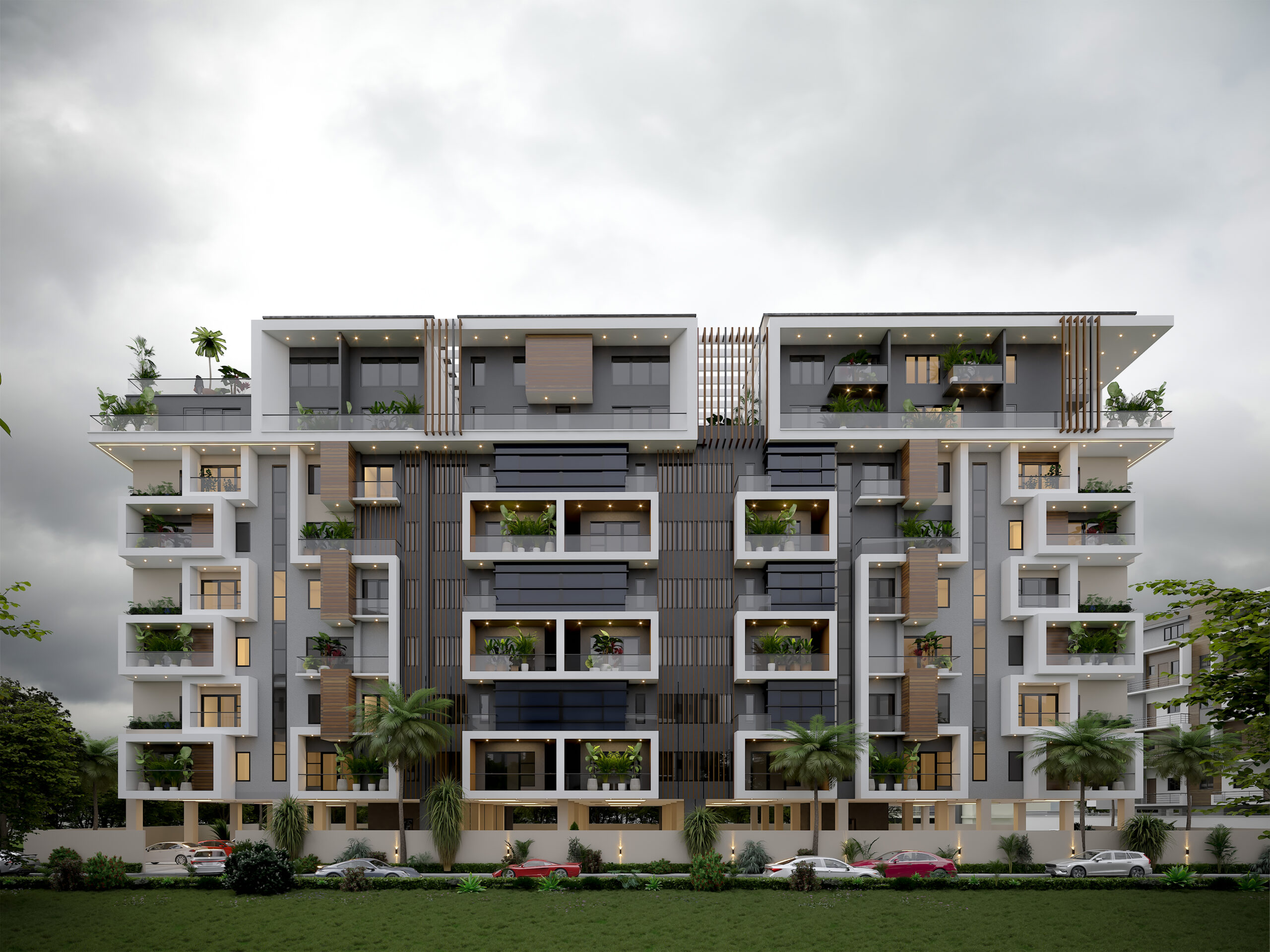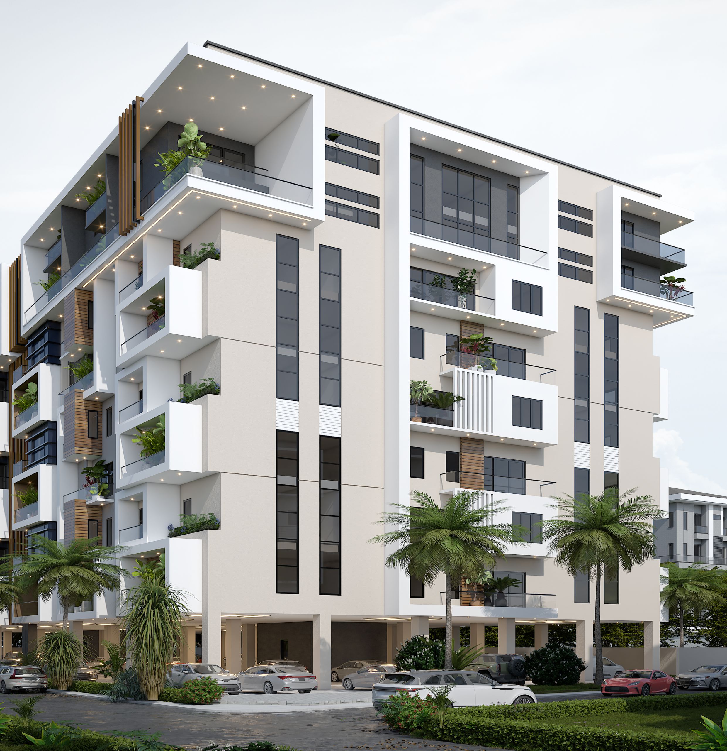 The Olivia Height project is a luxury mixed-use apartment complex , designed as an imposing high-rise building of Ground plus 10 floors. Architecturally, it is striking, featuring a modern facade with vertical wooden louvers and a dramatic, inclined wall clad in light-colored stone that is etched with a sophisticated geometric pattern. The development offers premium residences, such as 1-bedroom lofts and maisonettes, supported by amenities like elevators, continuous power, treated water, and 24-hour security. It is marketed as a pinnacle of luxury and architectural elegance in a coveted Lagos neighborhood.
